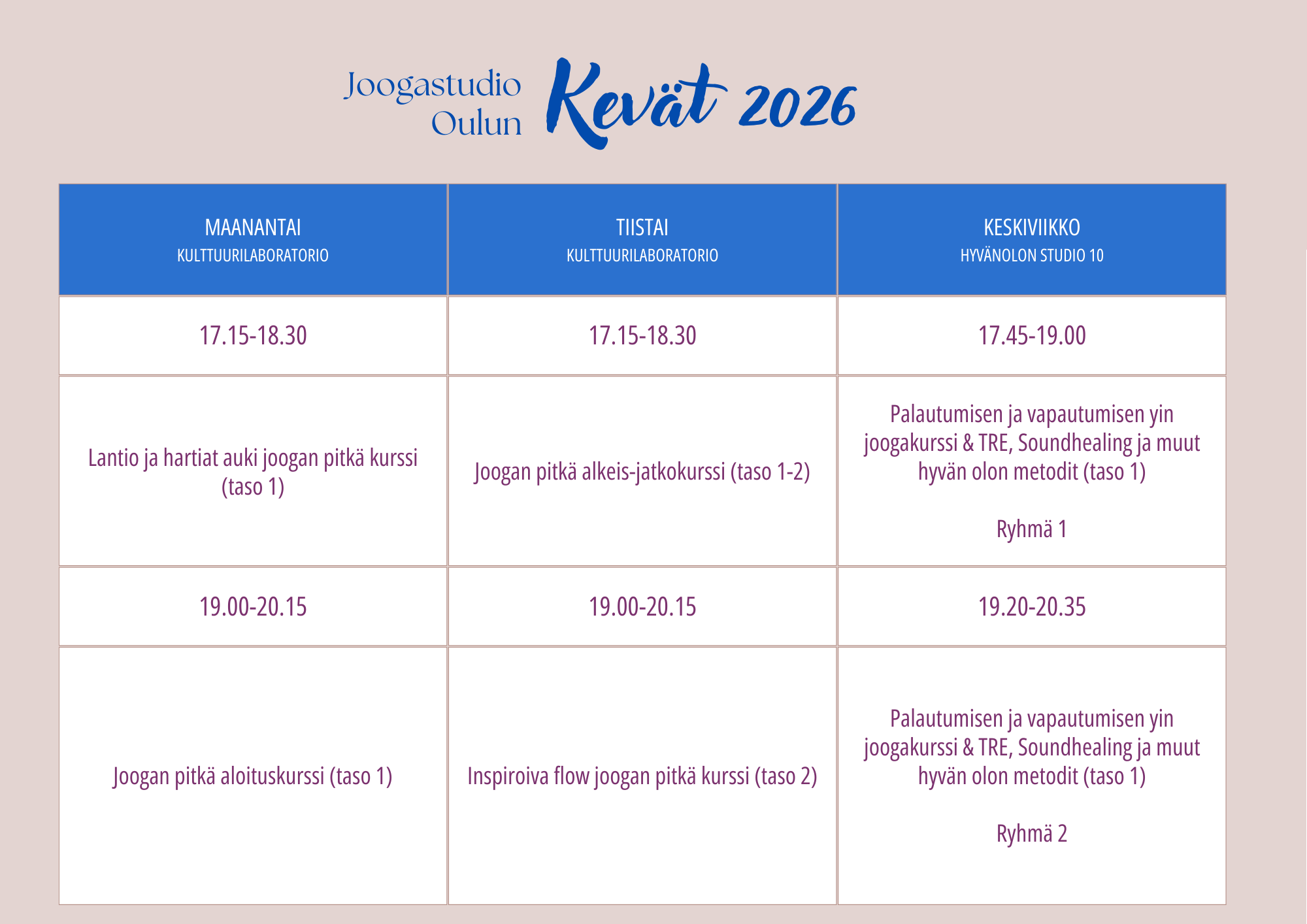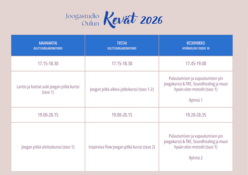 Kevään 2026 joogakurssimme ovat nyt julkaistu ja varattavissa! Kannattaa varata paikka kurssille, koska osalle kurssiryhmistä paikat ovat hyvin rajalliset.